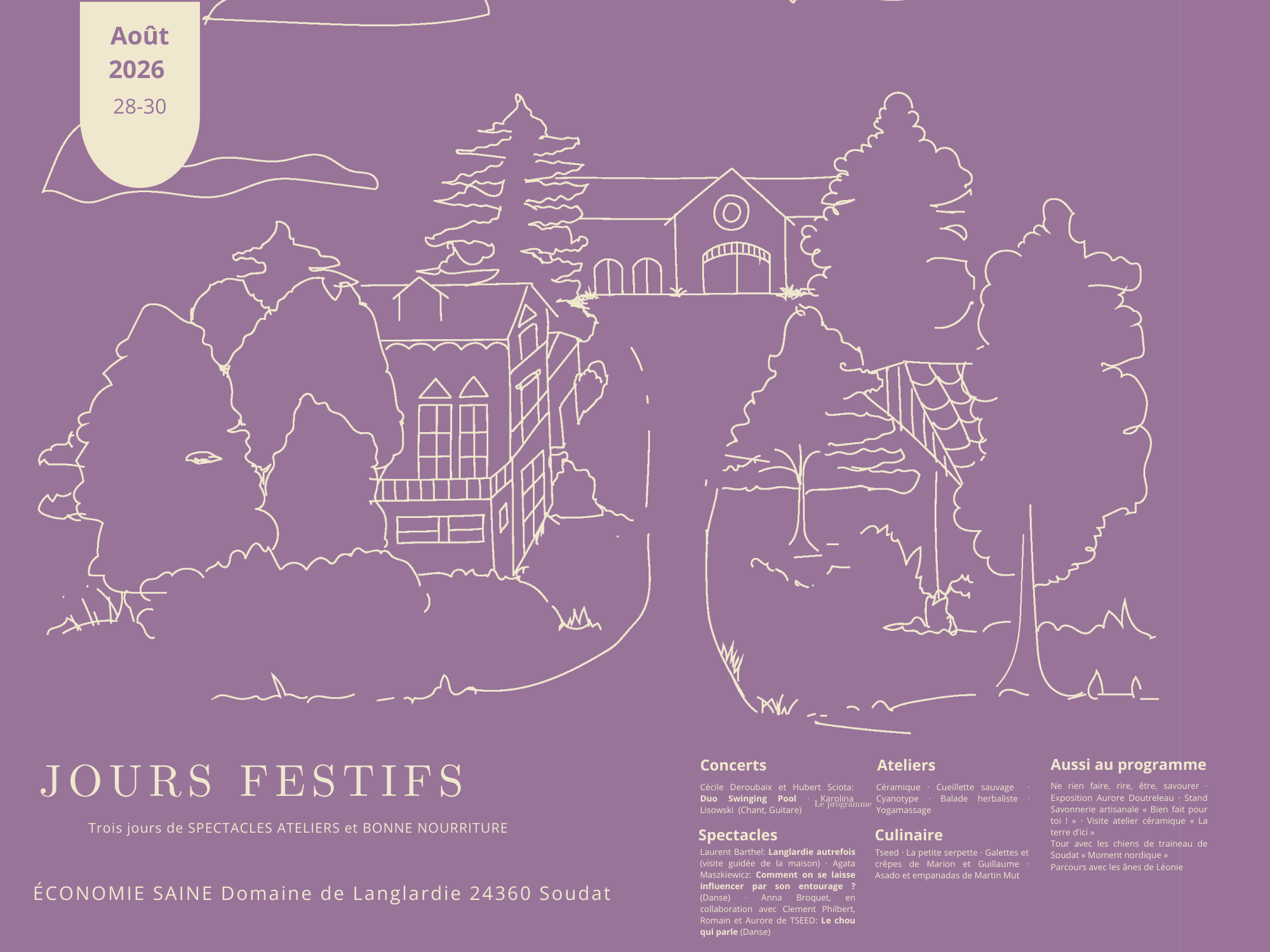 Prix: 25€ enfants 6-12 ans 12 € – dont 5 sont pour l’association économie saine. Participez à la restauration de la maison de caractère avec un supplément sur votre prix ou 1 nuit à Langlardie et avant un brunch .